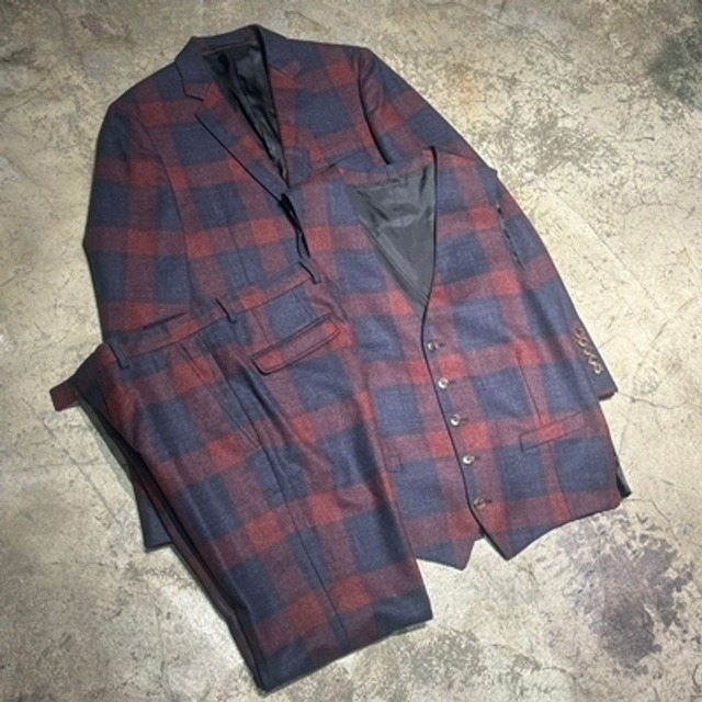 GUCCI グッチ 秋冬 チェック 3Pセットアップスーツ【表参道t】 ★商品について★ 当ブランドらしいデザインで3ピースの秋冬に最適なアイテムになります。 ★コンディション★ 中古品ですが着用時目立つ程の汚れやダメージはございません。 写真や記載内容と実物に相違がある場合(サイズ、商品状態など)も購入後の返金、キャンセルはできかねますので、予めご了承ください。 商品状態などはメール、お電話にてお答えさせていただきますので不明点がございましたらご購入前にお問合せくださいませ。 この商品のコンディション→【B】 ★カラー★ レッド系×ネイビー ★サイズ★ 表記サイズ:7-46R 平置き実寸サイズ ジャケット 着丈:約71cm 肩幅:約41cm 身幅:約48cm 袖丈(肩ライン~袖口):約65cm ジレ 着丈:約57cm 肩幅:約34cm 身幅:約46cm パンツ 丈:約96cm ウエスト:約40.5cm 股上:約22.5cm 股下:約74cm わたり:約25cm 裾幅:約17.5cm ★素材★ 毛100% 裏地:レーヨン キュプラ100%