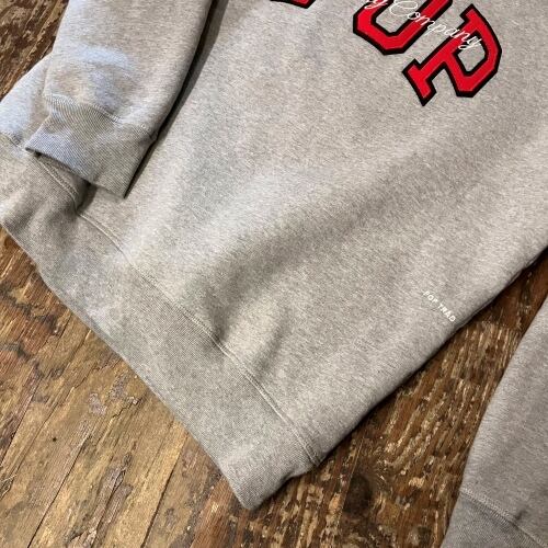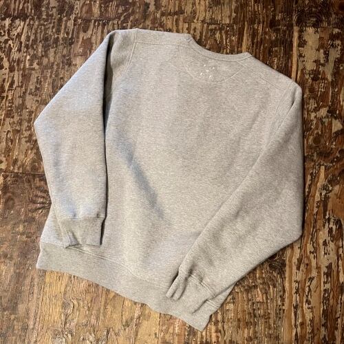 裏起毛のしっかりした生地感が特徴で、前面のパッチワークや、左脇腹部分のロゴ刺繍、背面首元のさりげないデザインなどがアクセントになっています。