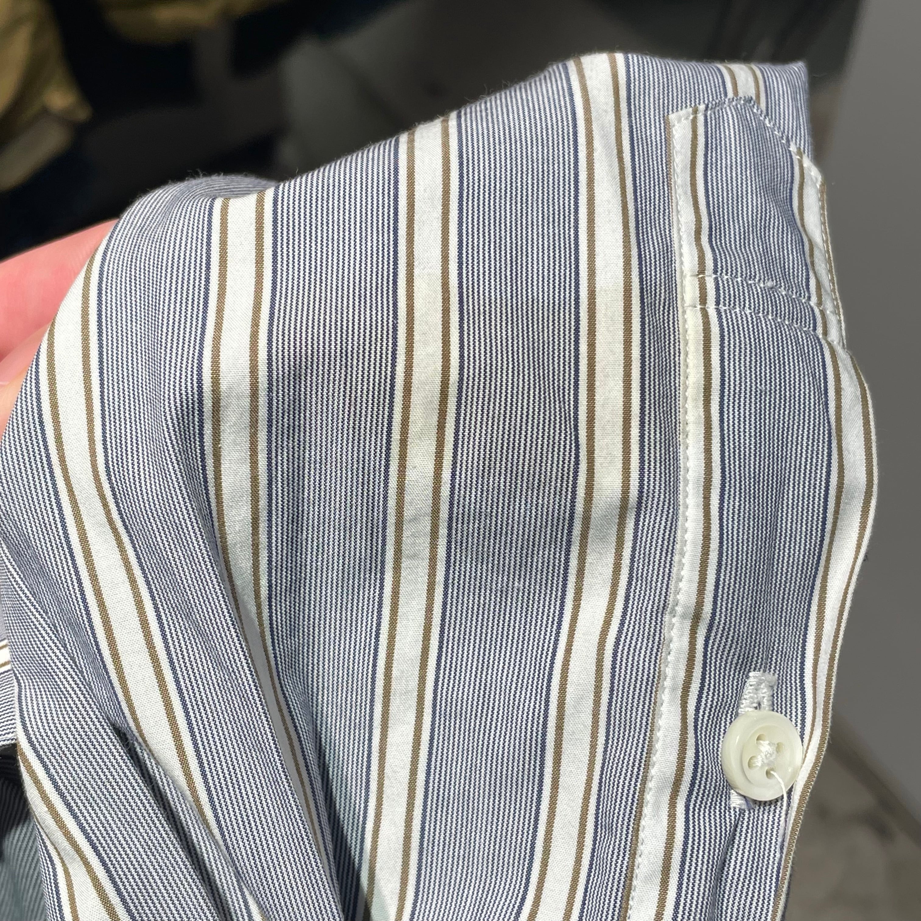 トワロニエ18SSのストライプシャツになります。 サイドに深めのスリットが入っており縛れる紐が付いております。