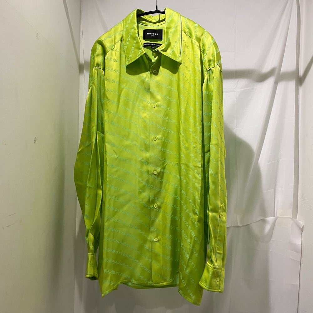 シルクのような質感やネオンカラー、全体に施されたロゴデザインが特徴的なアイテムです。背面にタック有り、腰部分にボタンで長さを調節してウエストを締められるベルトが付いています。