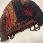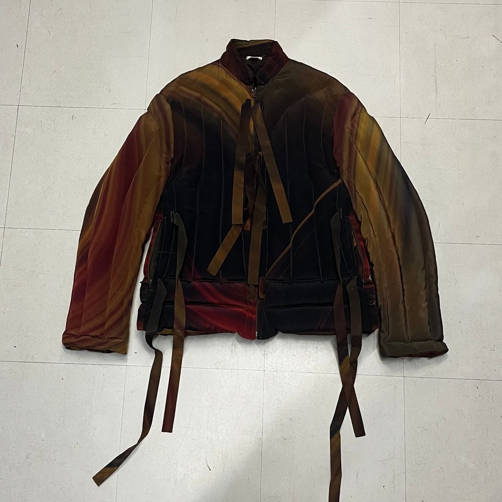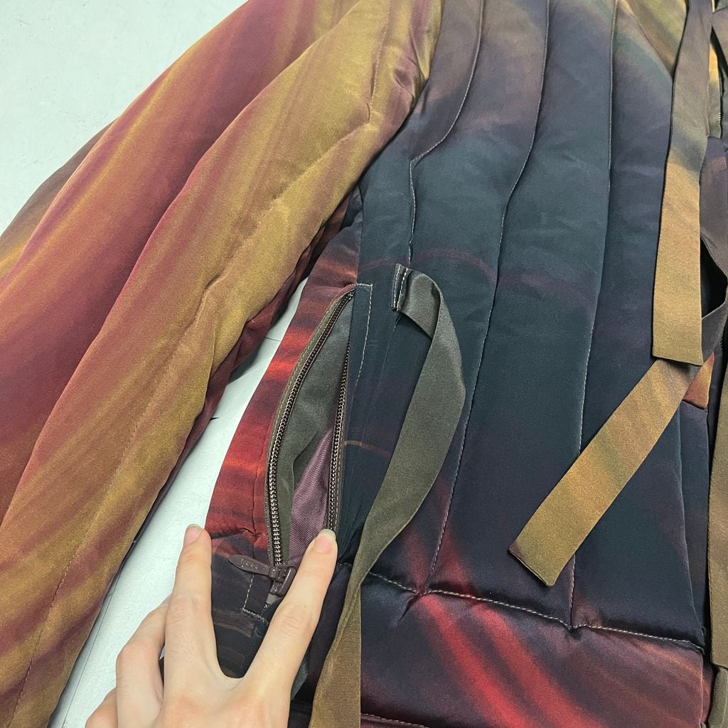 地層をイメージして作成したグラフィックを用いたシルク100%のダウンジャケットです。