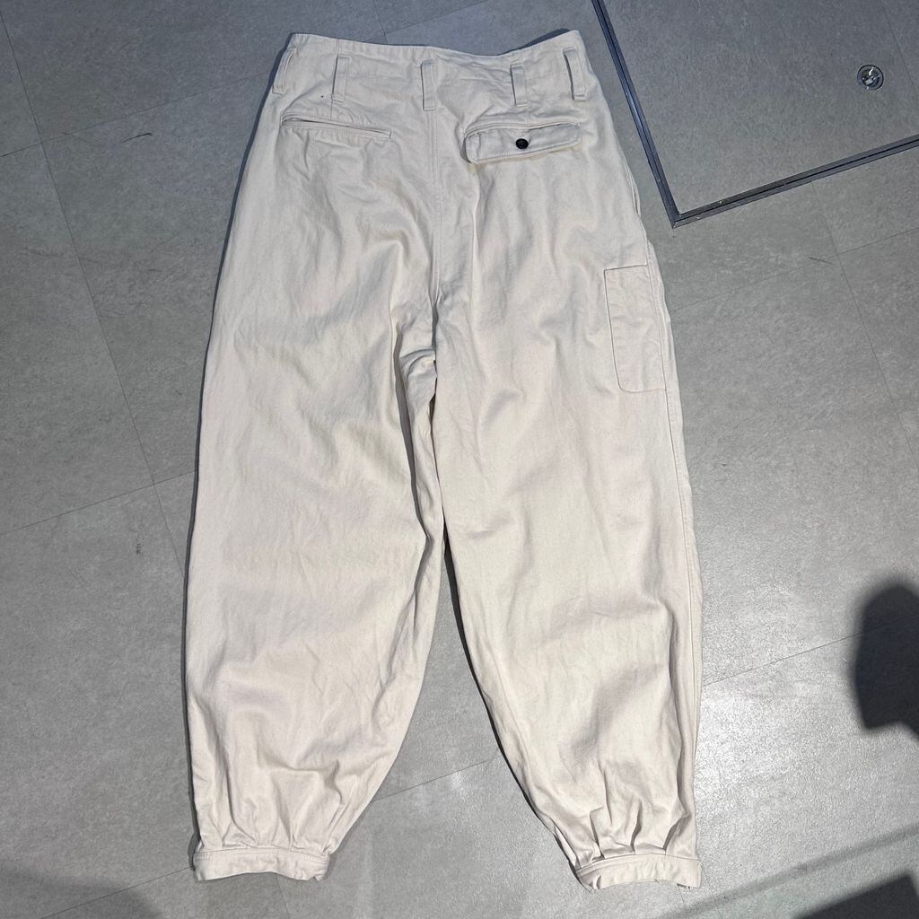ワンウォッシュをかけ、硬さを抑えており、独特のワイドテーパードシルエットになっています。