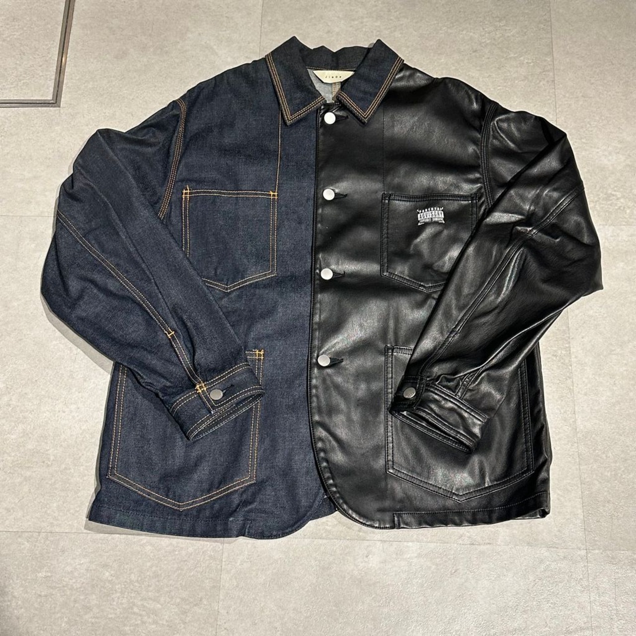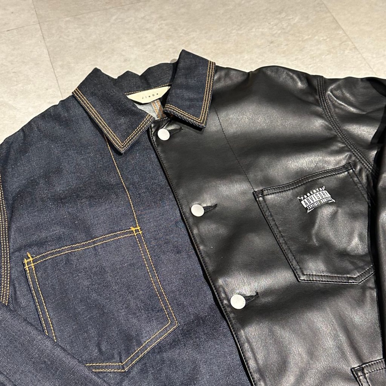 左右でレザーとデニムの切り返しのデザインが特徴のジャケットになります。