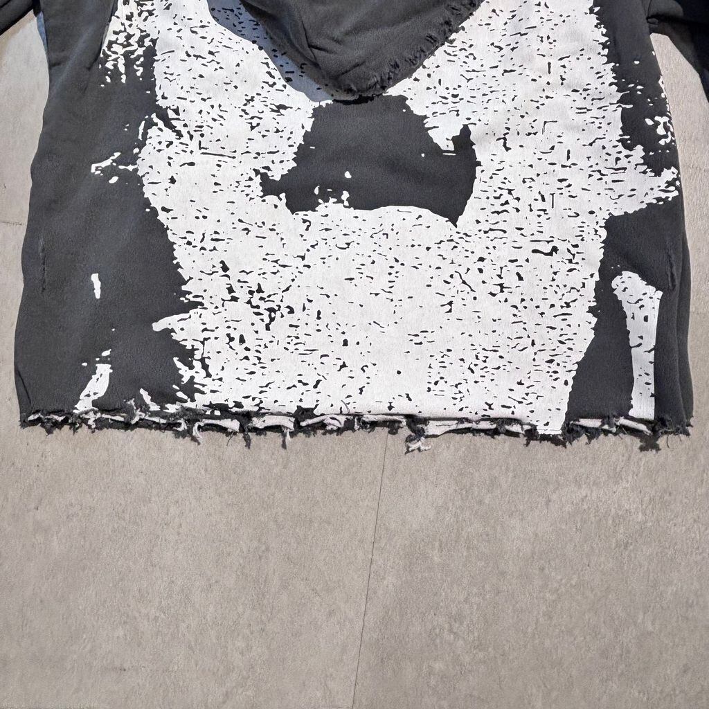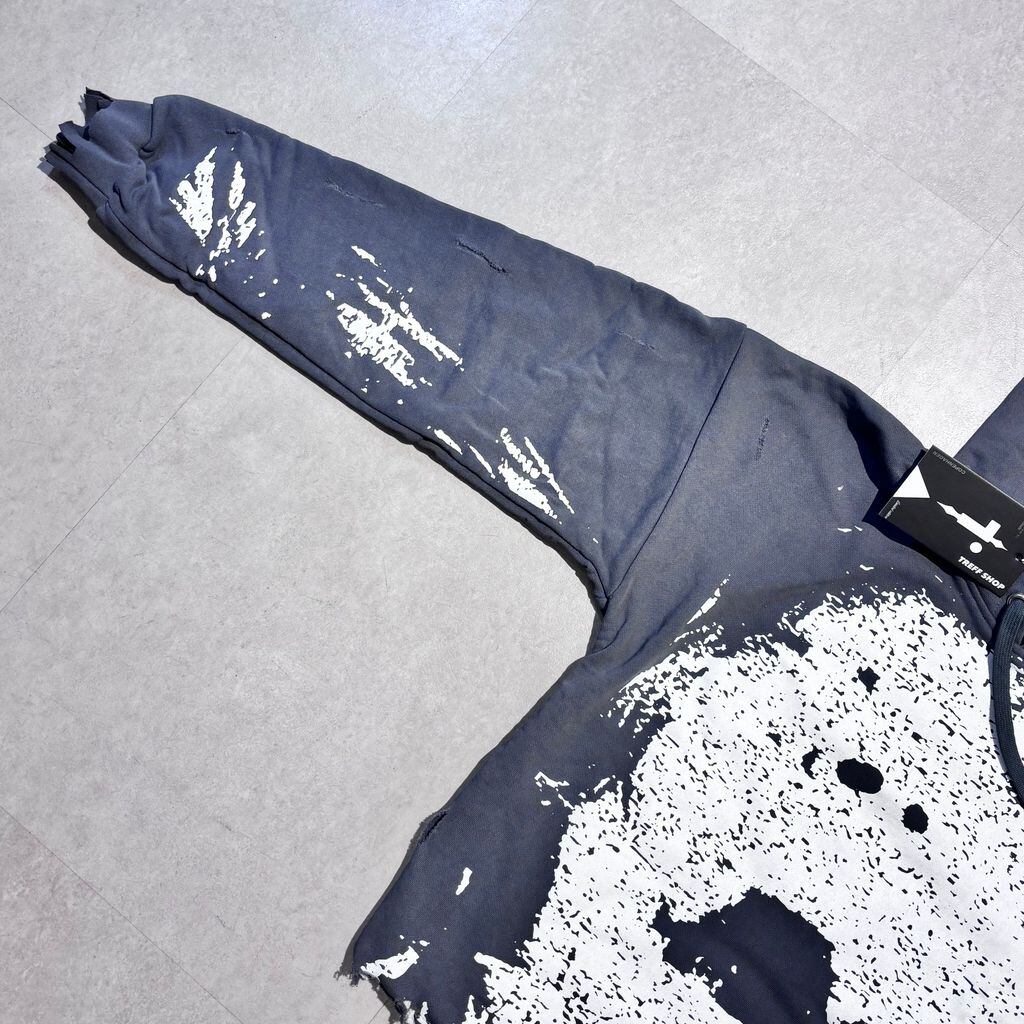 裾の部分が切りっぱなしの様なデザインになっていて各所にあるダメージ加工とフロント部分のデザインが特徴的なアイテムです。