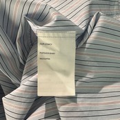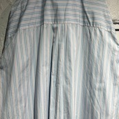 きめ細かいストライプの柄と裾が広がったシルエットのプルオーバーの形が特徴のシャツになります。
