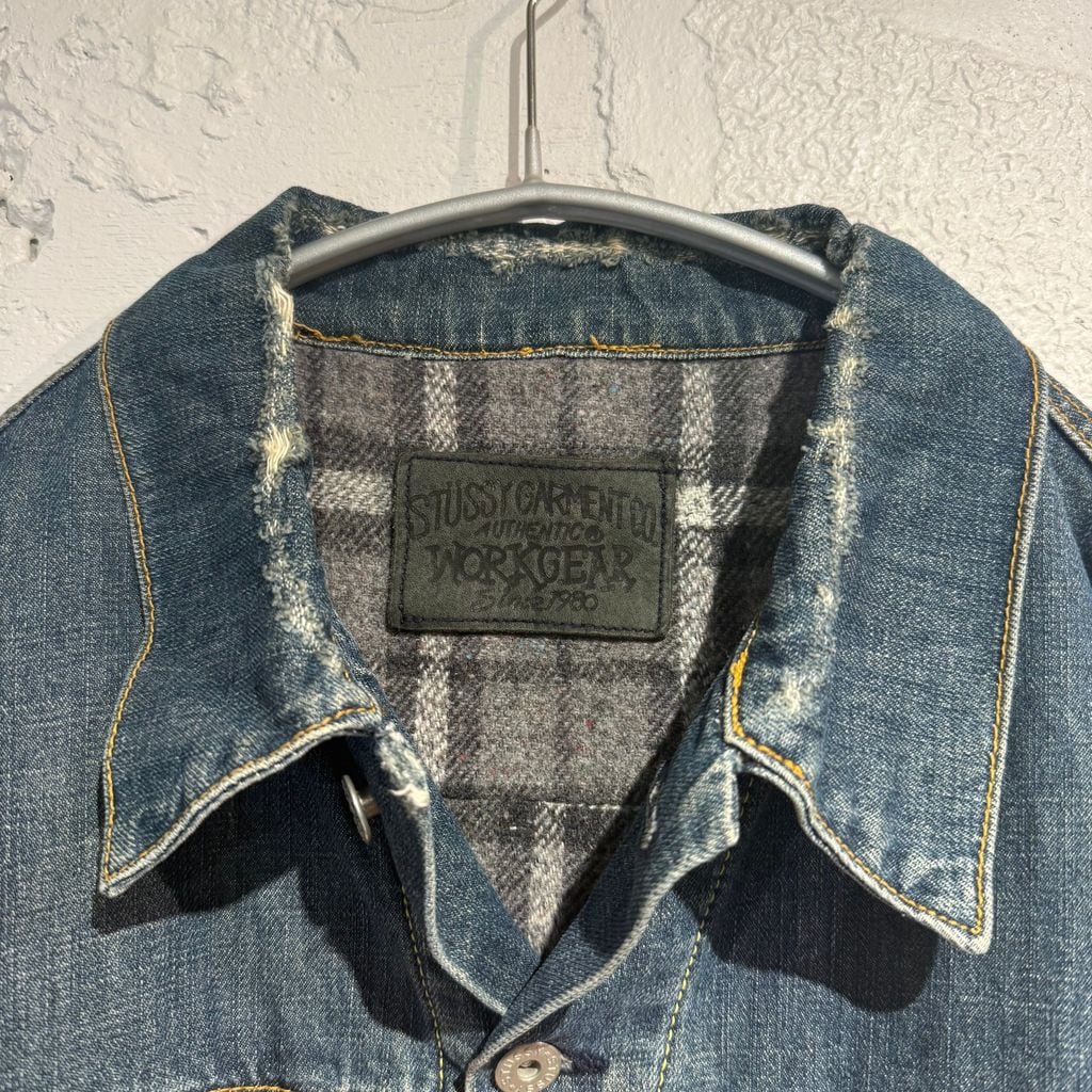 裏地にチェック柄のフェルト生地を採用した、ダメージ加工のデニムジャケットです。