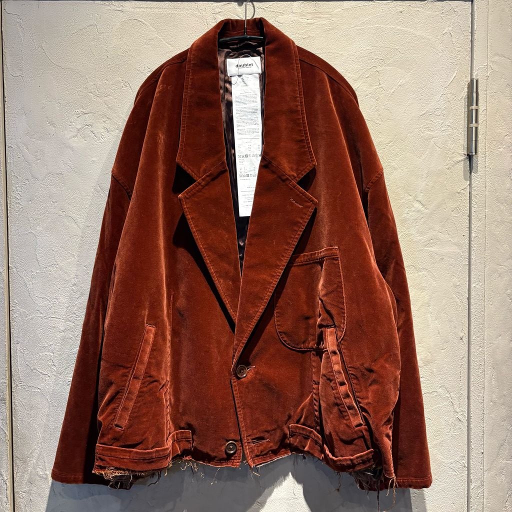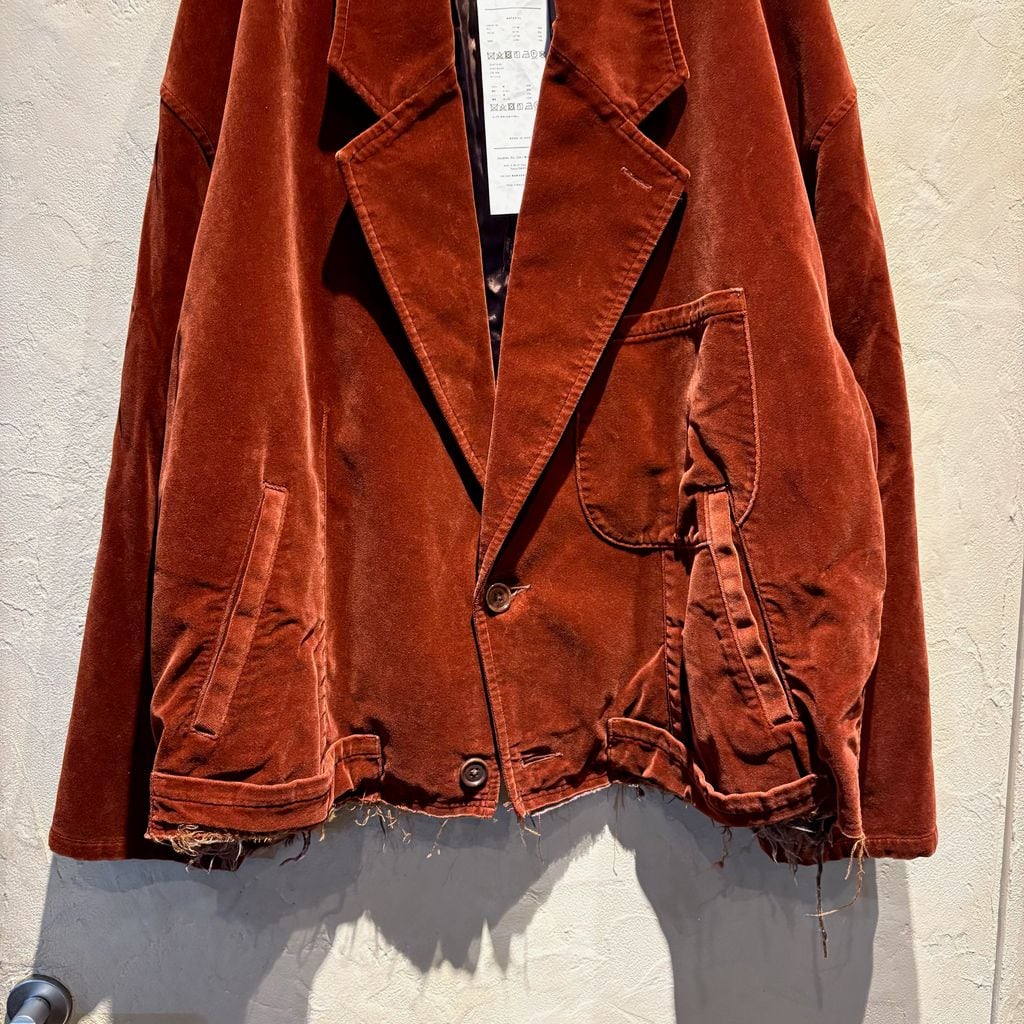 裾部分の切りっぱなしデザインが特徴的なベロア素材のジャケットです。