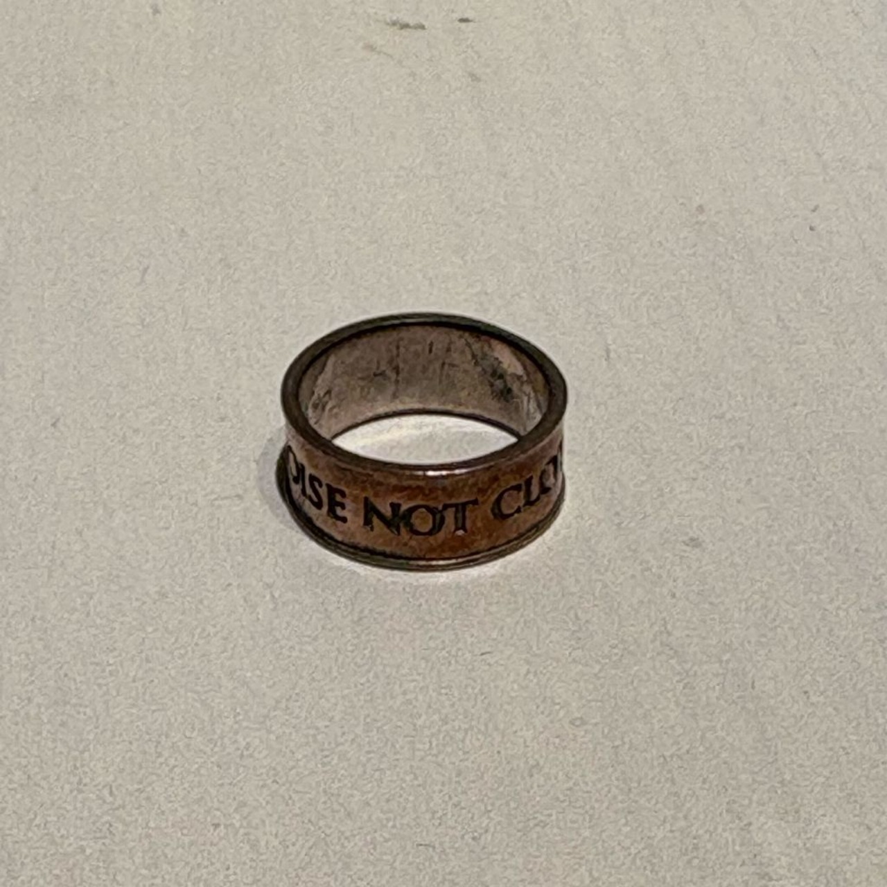 「WE MAKE NOISE NOT CLOTHES」と刻印されたリングです。