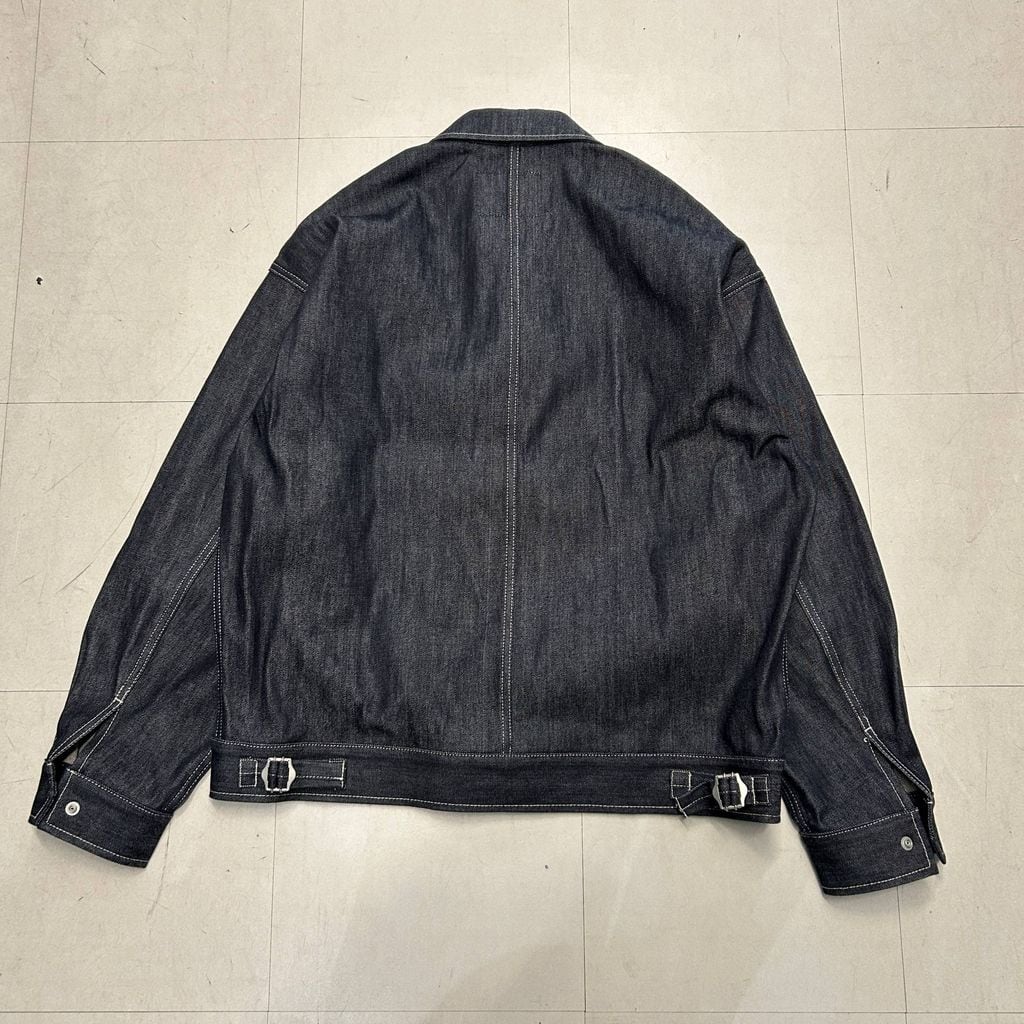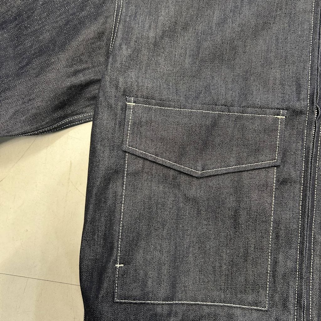 生地表面のざらっとした凹凸やムラがデニム本来の風合いを感じさせる魅力的な素材。コンパクトな身幅に反して大胆にドロップしたショルダーと大振りなスリーブが特徴のフロントジップジャケット。