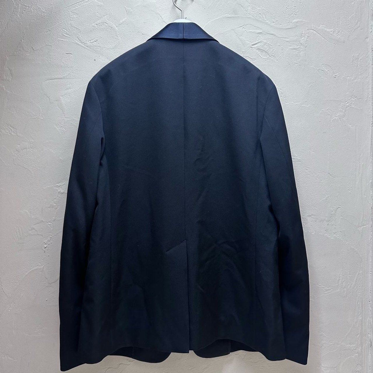 ショールカラーで光沢のある素材が特徴的なアイテムです。
