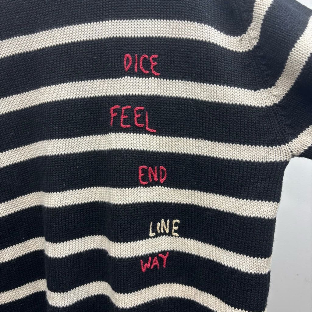 手縫いの刺繍文字のようなデザインが入ったニットセーターです。