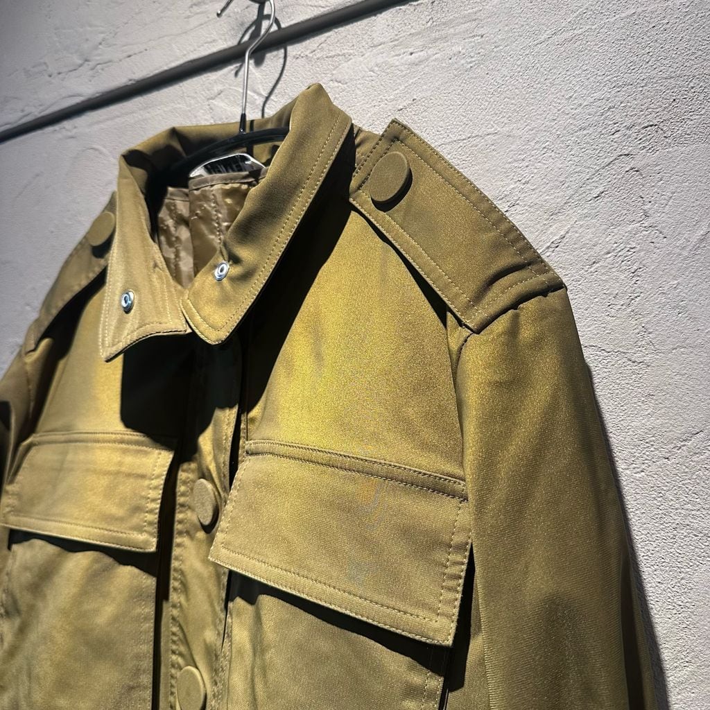 シンプルなナイロン生地のコートにフリルがついたアイテムです。