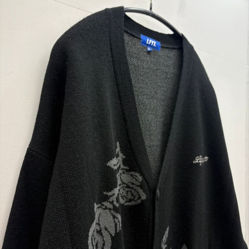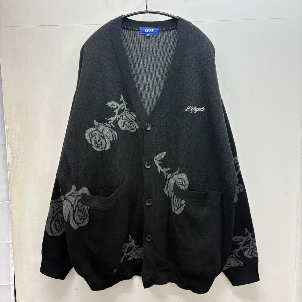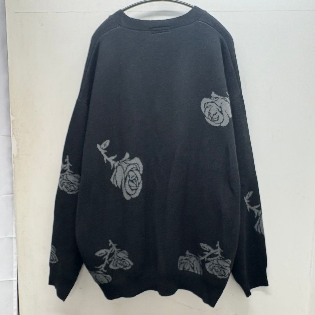 薔薇モチーフのパターンを全身に配したニットカーディガンです。