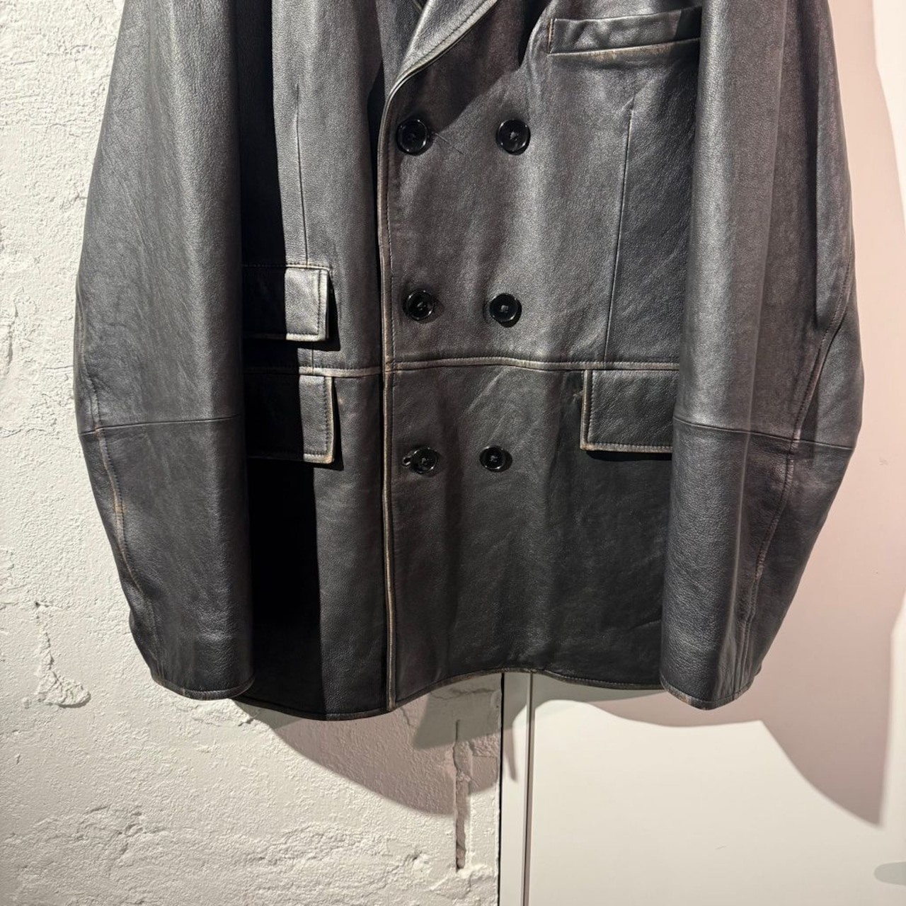 ブラウンに染めたレザーの上からブラックに染めているので