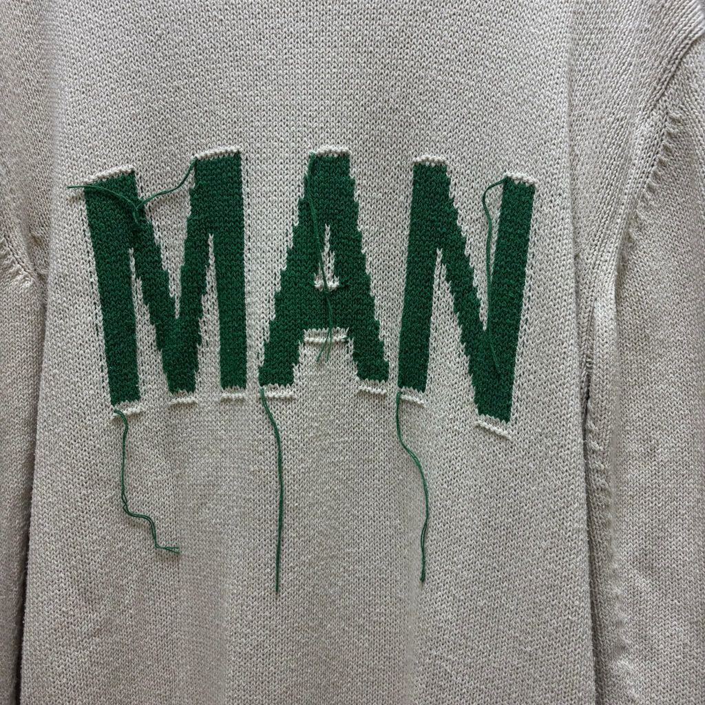 「MAN」の文字が刺繍されていて、随所に戻りのステッチがあるのが特徴的なアイテムです。