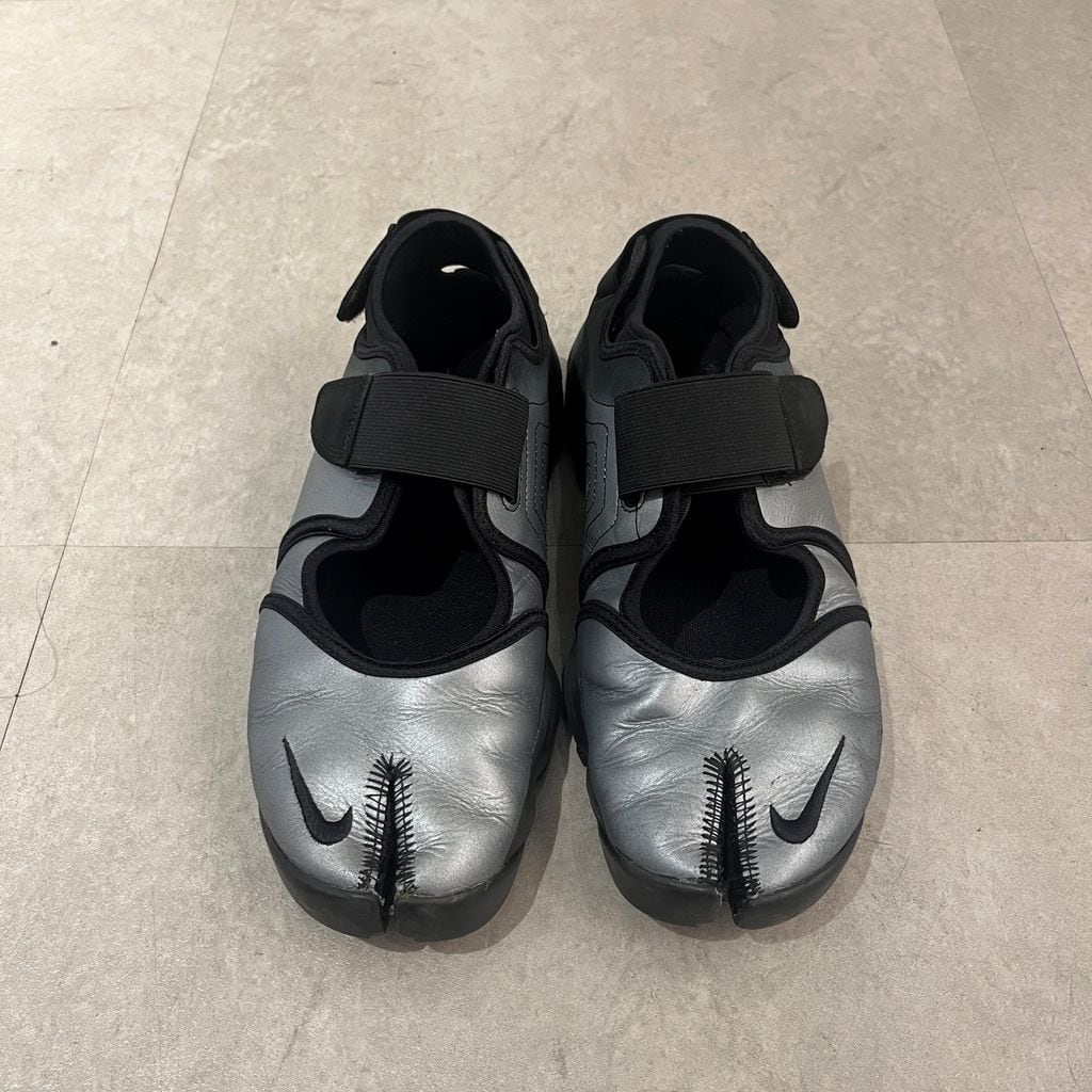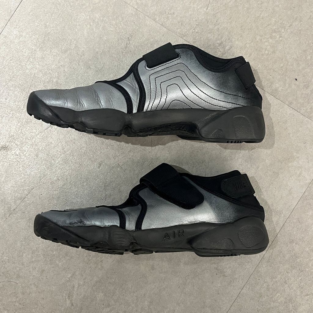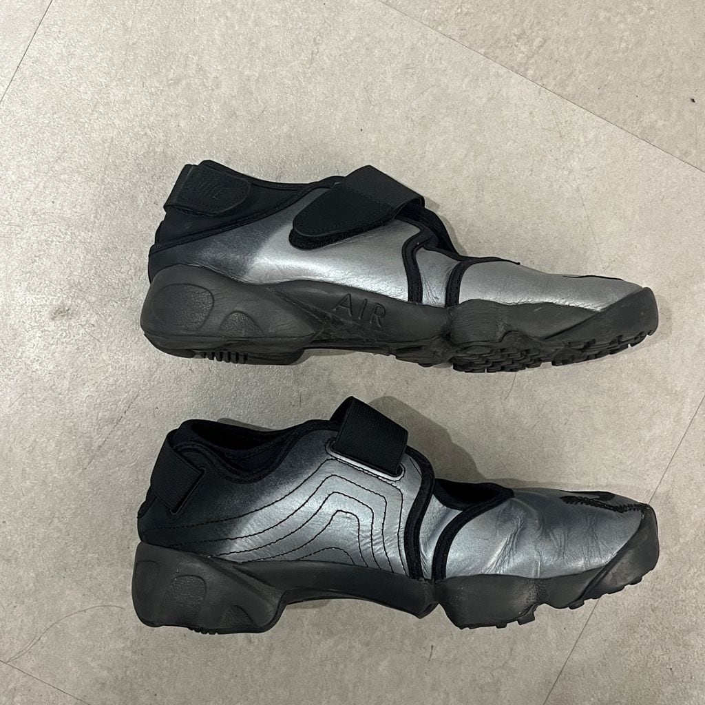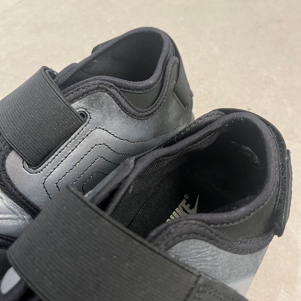 甲部分から踵にかけてシルバーからブラックのグラデーションになっているデザインが特徴的。革が柔らかく歩きやすいアイテムです。