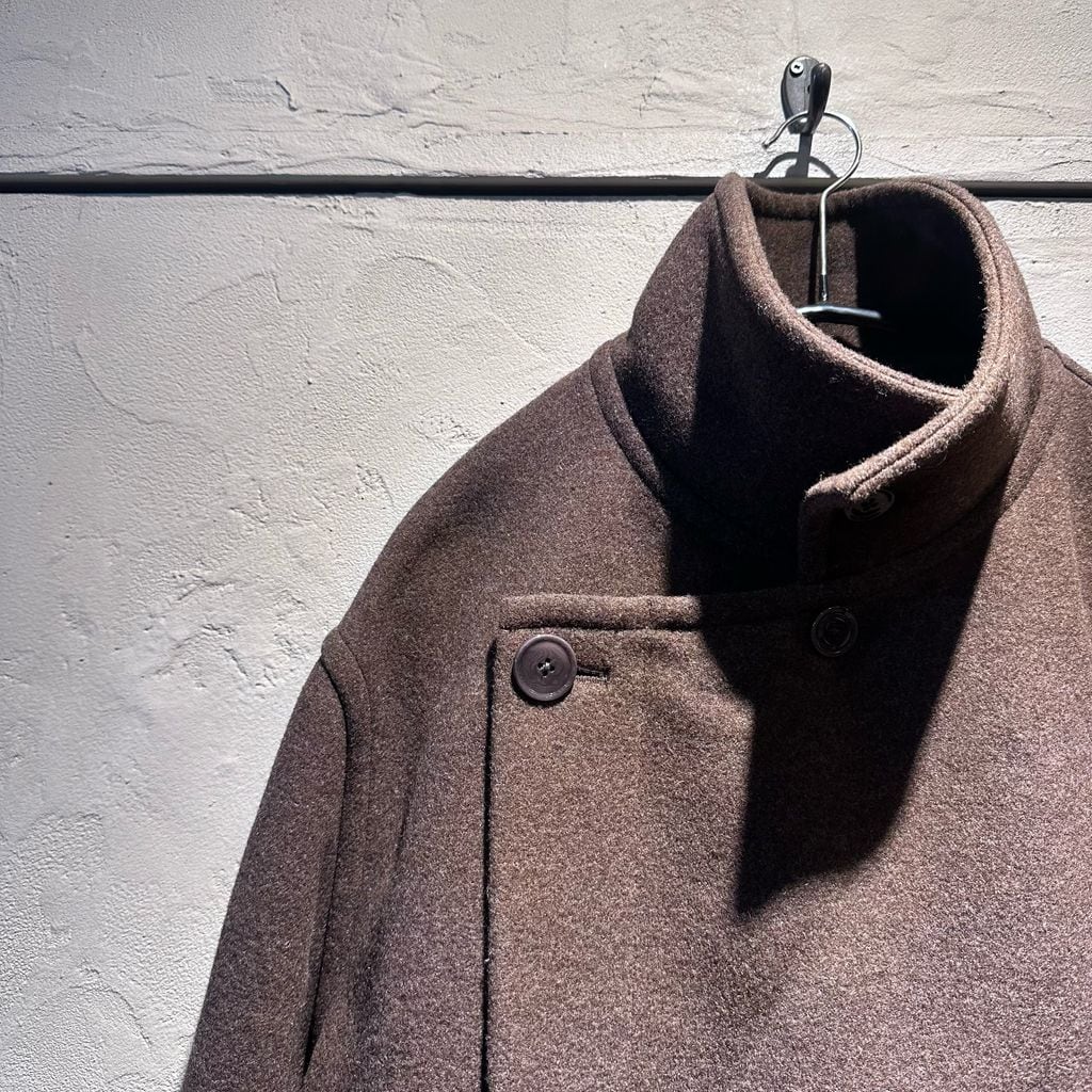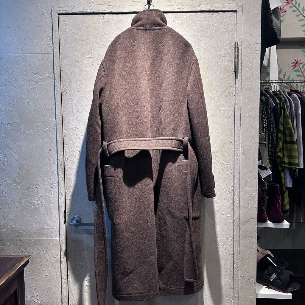 バスローブのようなフィットで仕上げられた、ロング丈のラップコートです。高めに設定したスタンドカラーと、丸みのあるドロップショルダーが特徴で、上質で保温性に優れた両面先染めを施したダブルウール素材を採用したアイテムです。ウエストはベルトで調整可能。