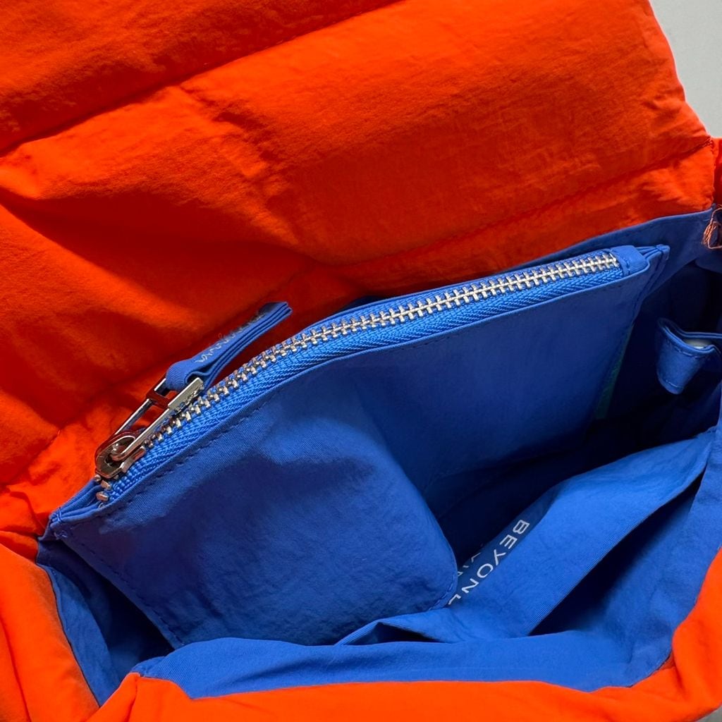 鮮やかなオレンジ色のショルダーバッグ、内側は青色で小型ポーチ付きです。