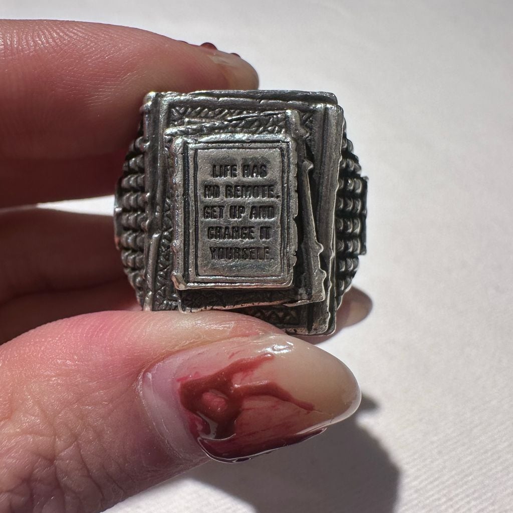 本が積み重なったデザインでトップの表紙には「人生にリモコンはない。自分の手で変えてみせろ」というメッセージが刻印されています。