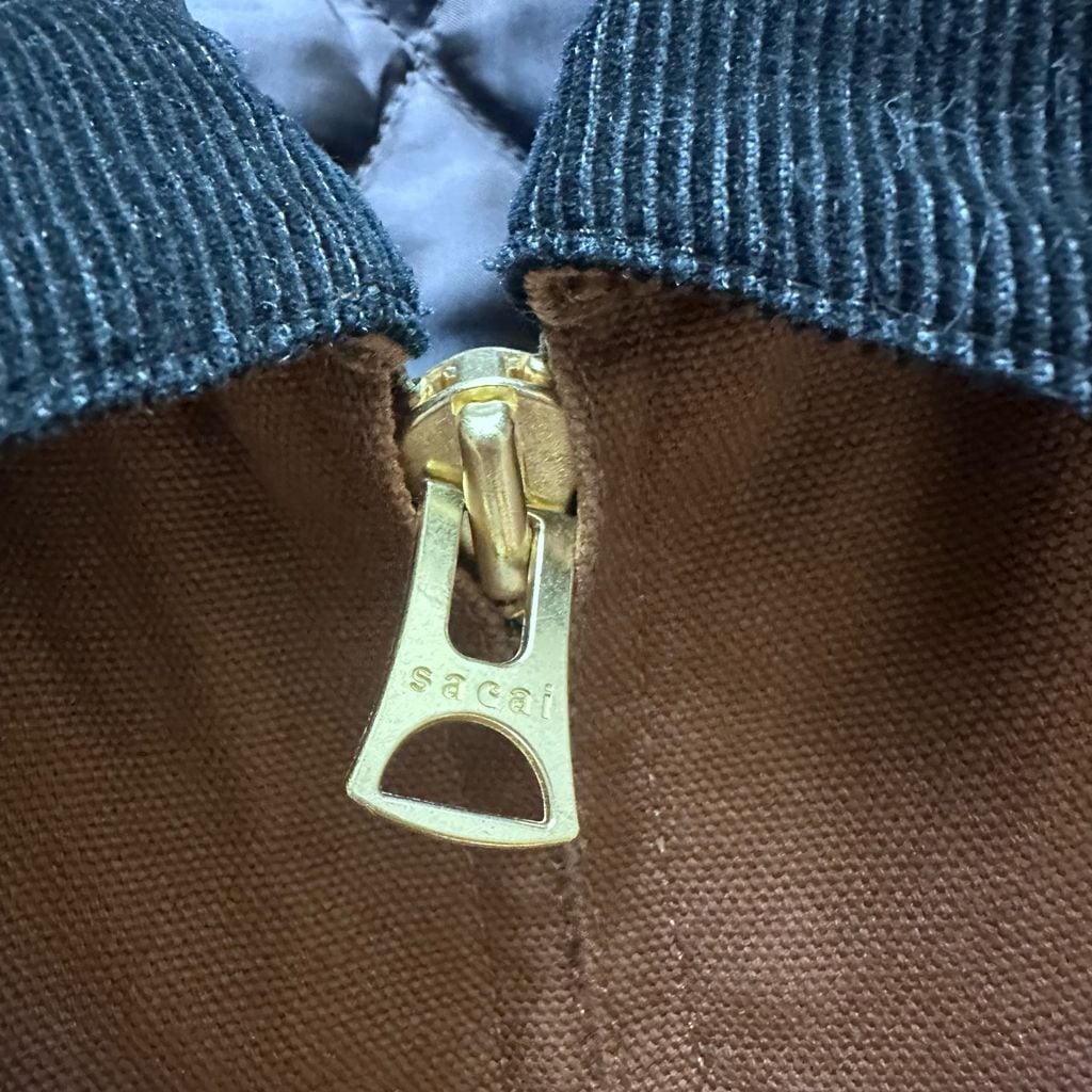 コーデュロイの襟や素材感などCarharttらしいディティールは残しつつ、sacai特有のパネル切替など程よいバランスで構築されています。