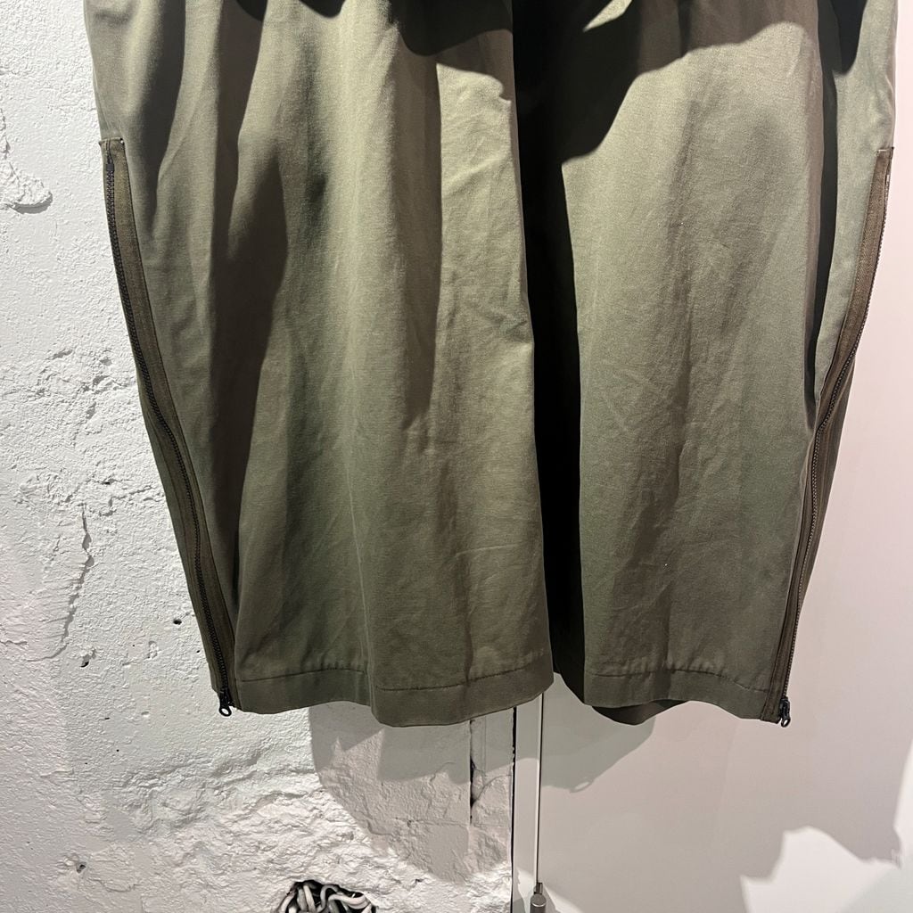 ノーカラーのシンプルな形のコートですが、サイドのジップなど所々に遊びのあるデザインです。2本のベルトが特徴的。