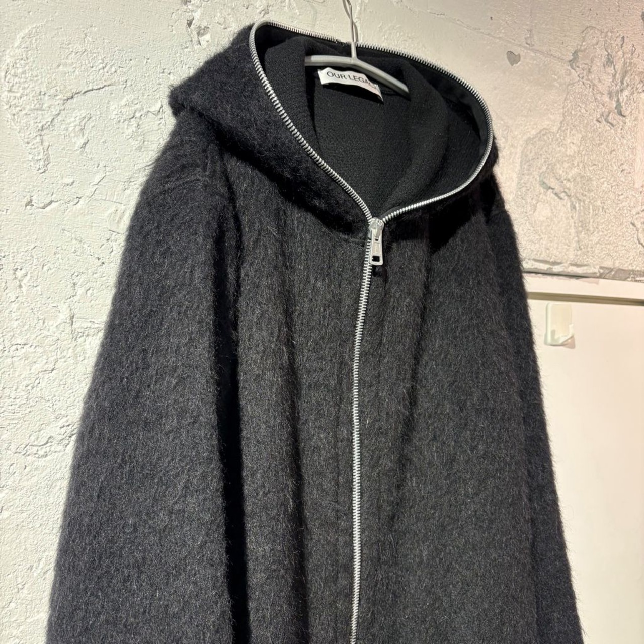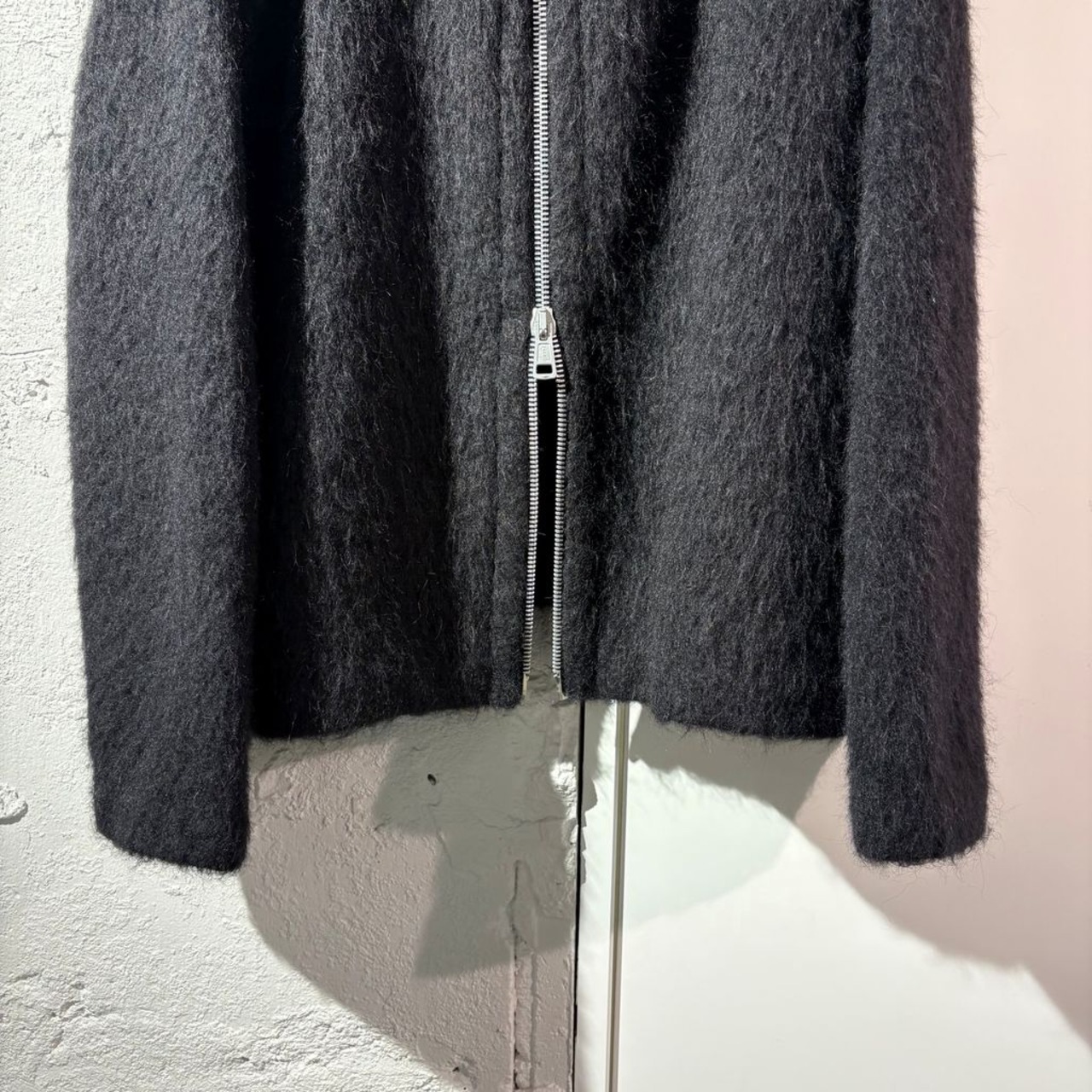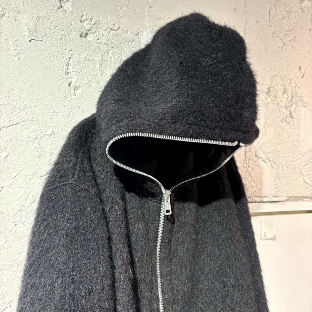 モヘアの質感とフロントを完全に開閉可能なデザインが特徴的です。