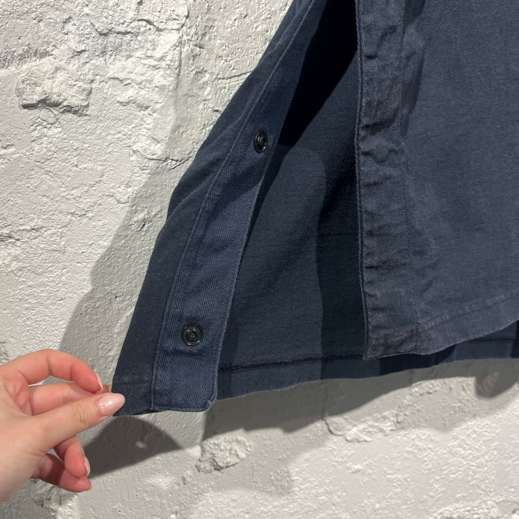 胸ポケット部分の上からロゴ刺繍がされているTシャツ。サイドのスリット部分はスナップボタンで調節可能です。