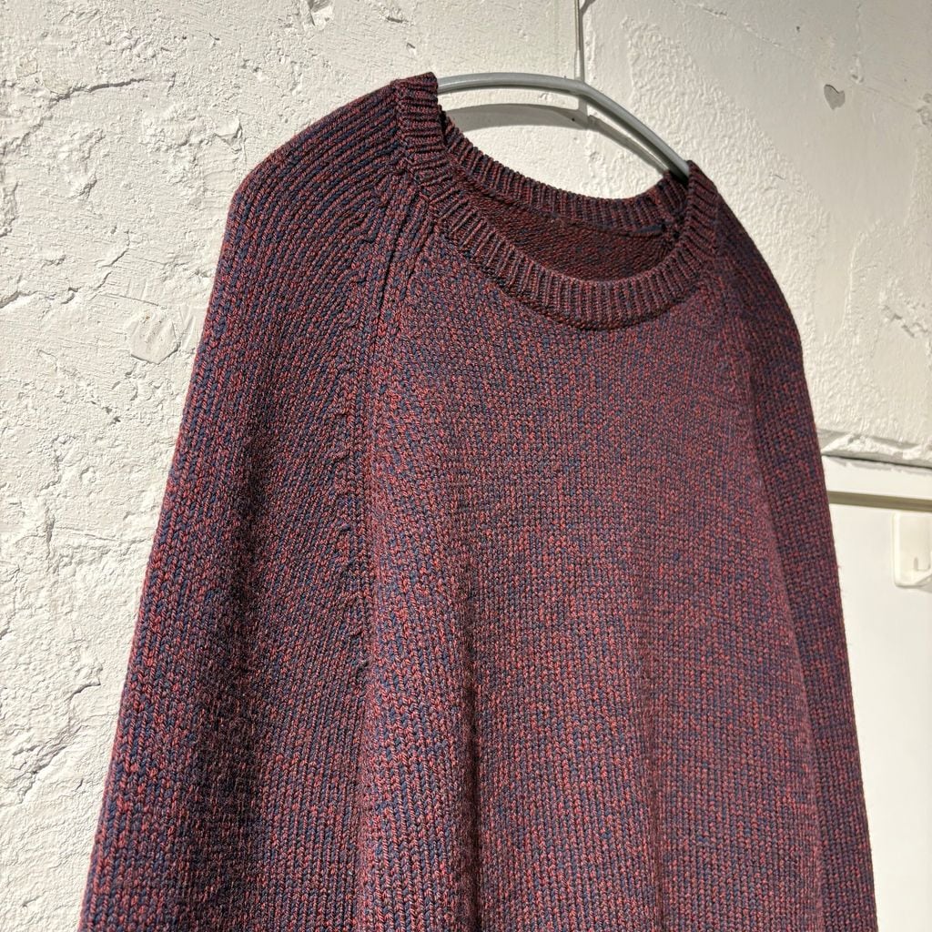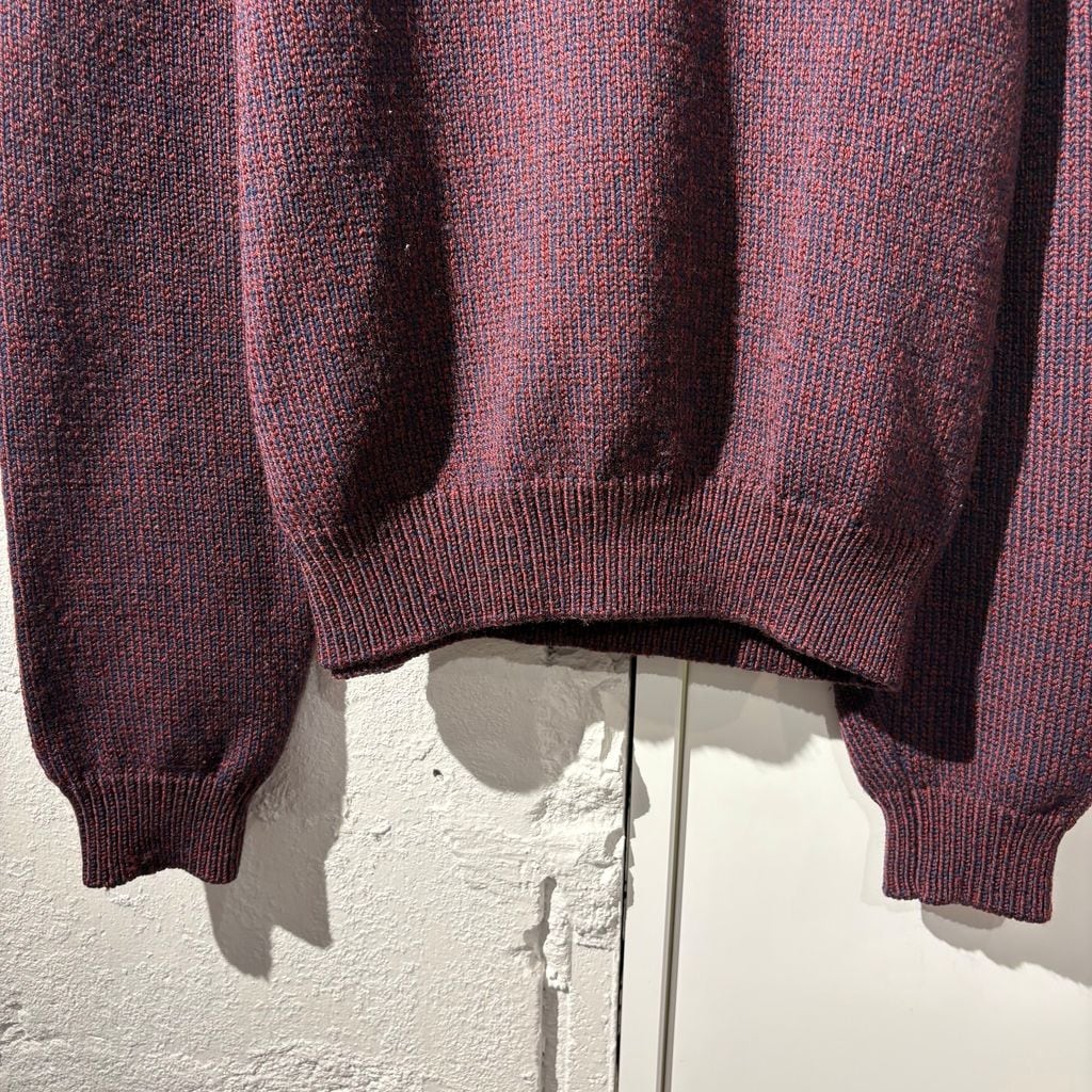 レッドとネイビーが混ざった糸で編まれたニットです。