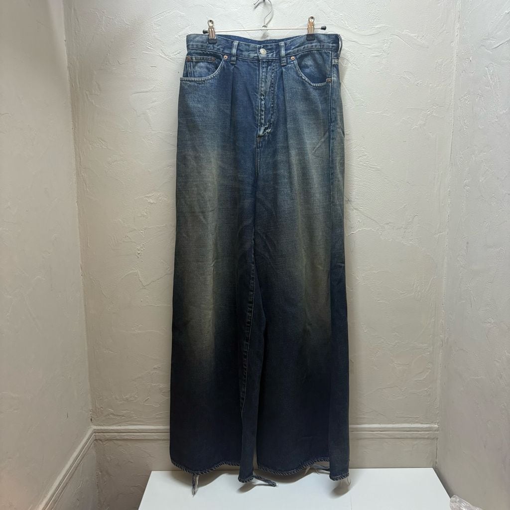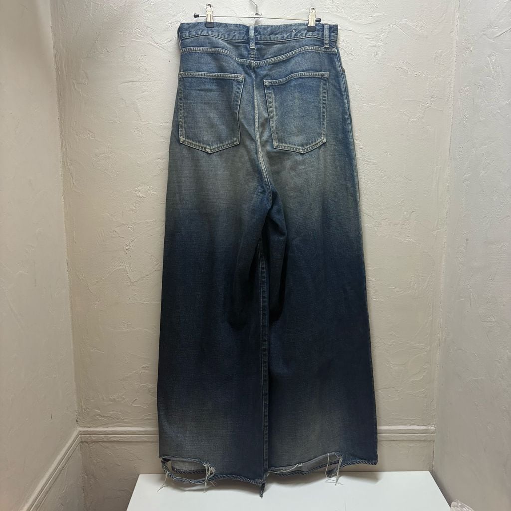 裾のダメージ加工やゆったりとしたシルエットが特徴的な汎用性の高いデニムパンツです。