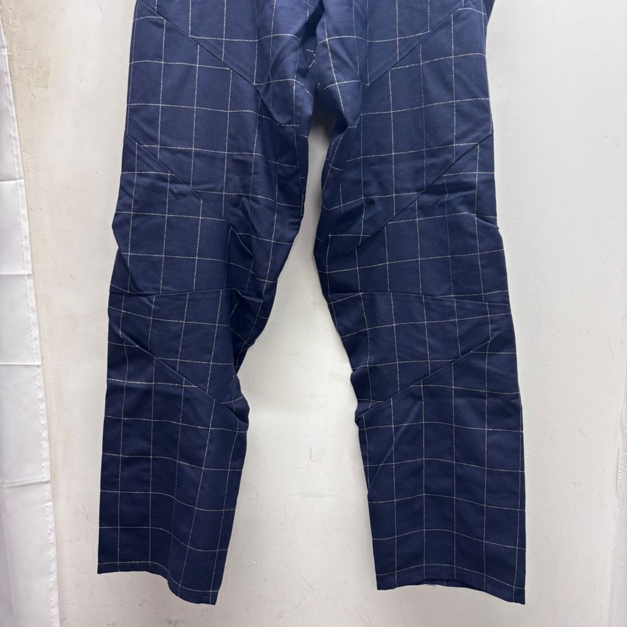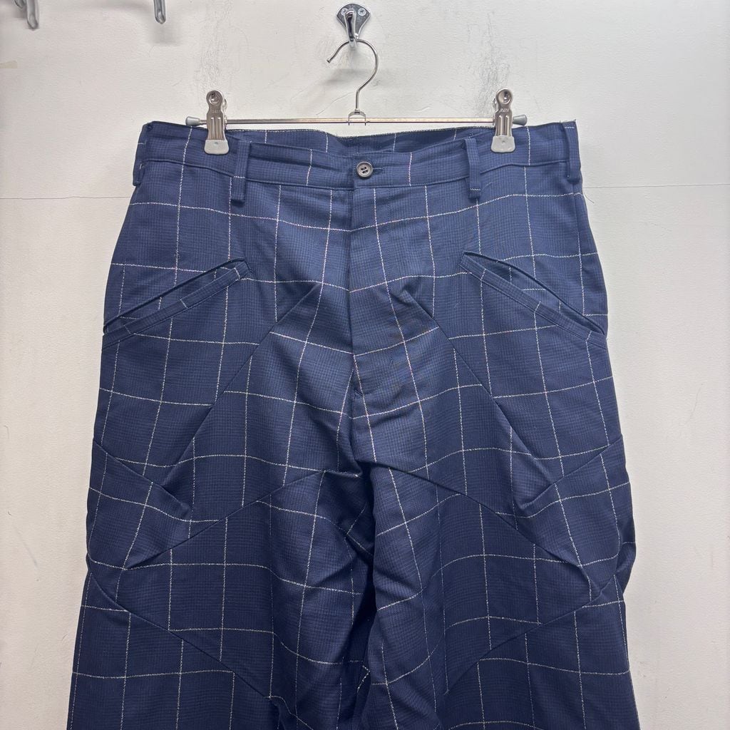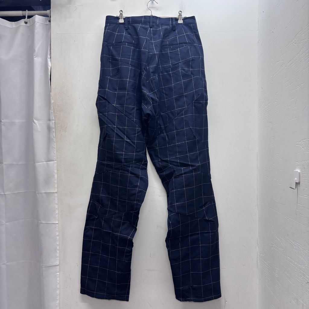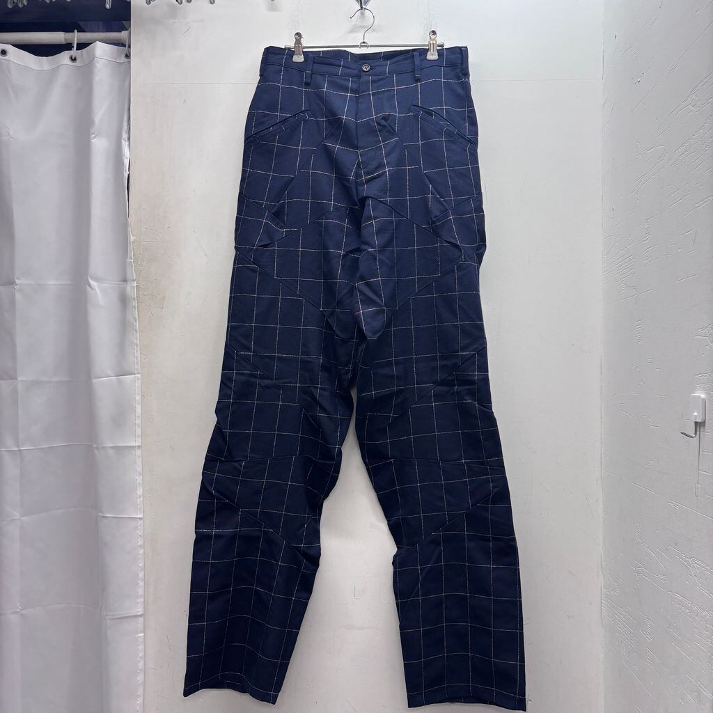 不規則な縫込みが多数入っていて格子柄が歪んで見える独創的なデザインのアイテムです。