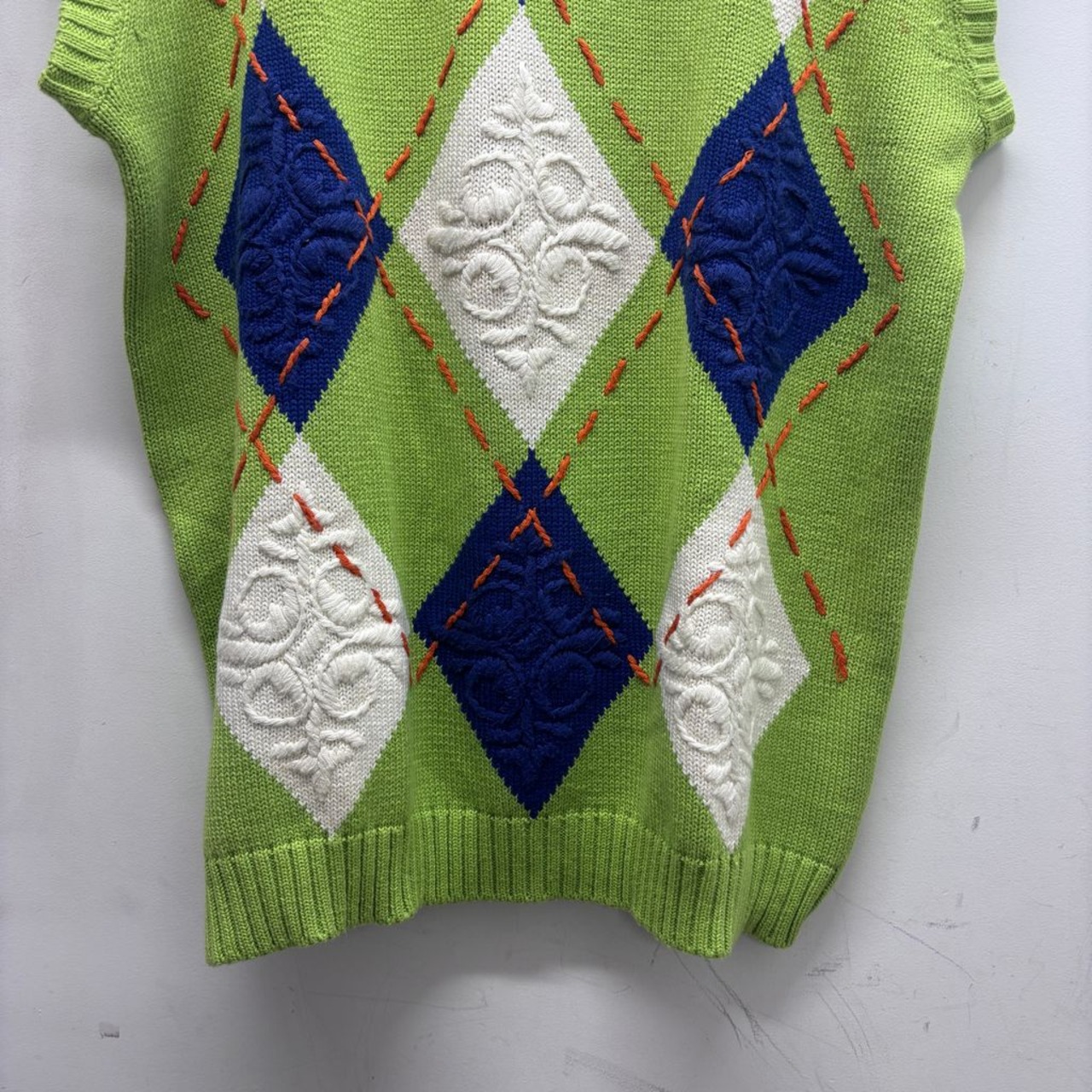 アーガイル柄のオレンジステッチが特徴的なニットベストです。