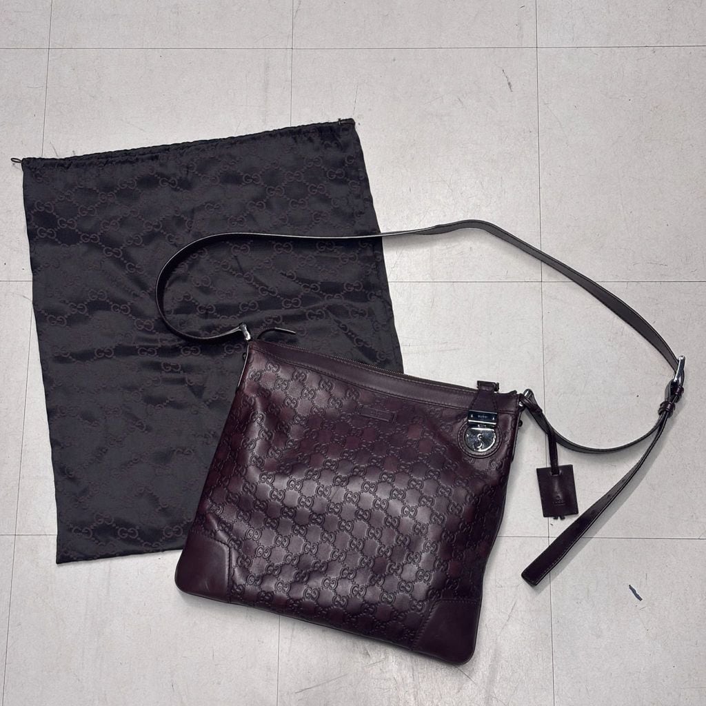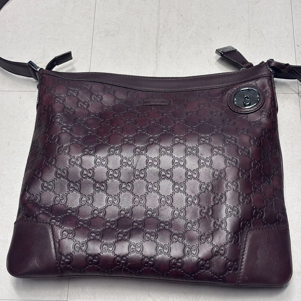 ブランドを象徴するGGパターンの型押しが全面に施され、高級感のあるレザーのショルダーバッグです。
