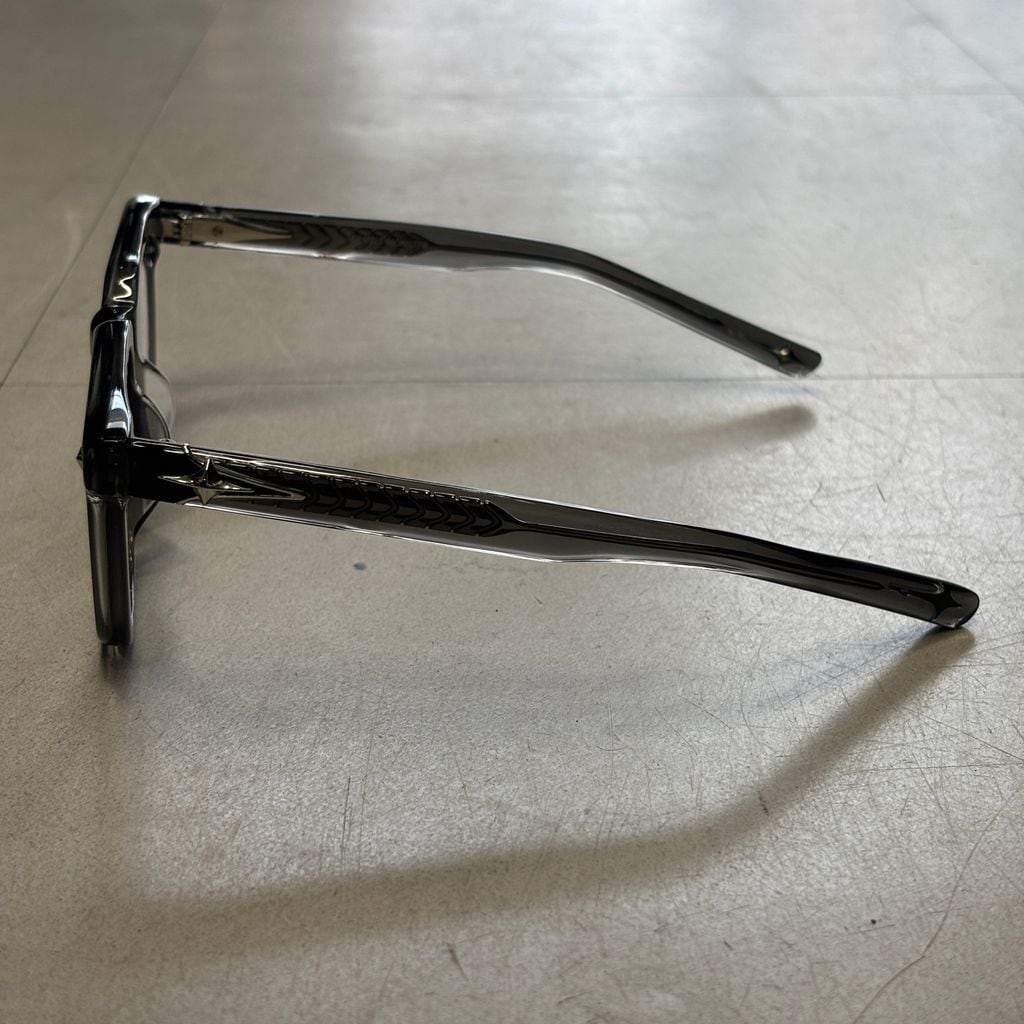 立体感のあるスクエアシェイプにスモークグレー調のクリアフレーム。