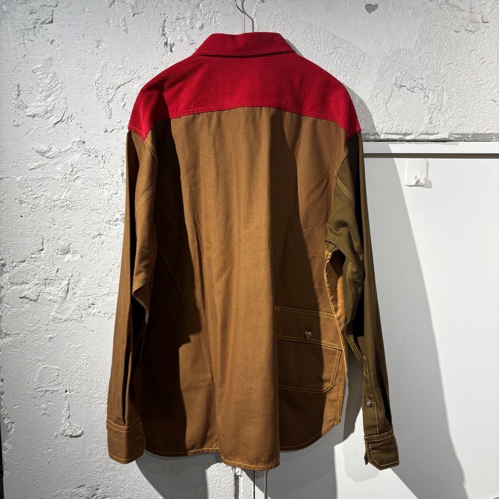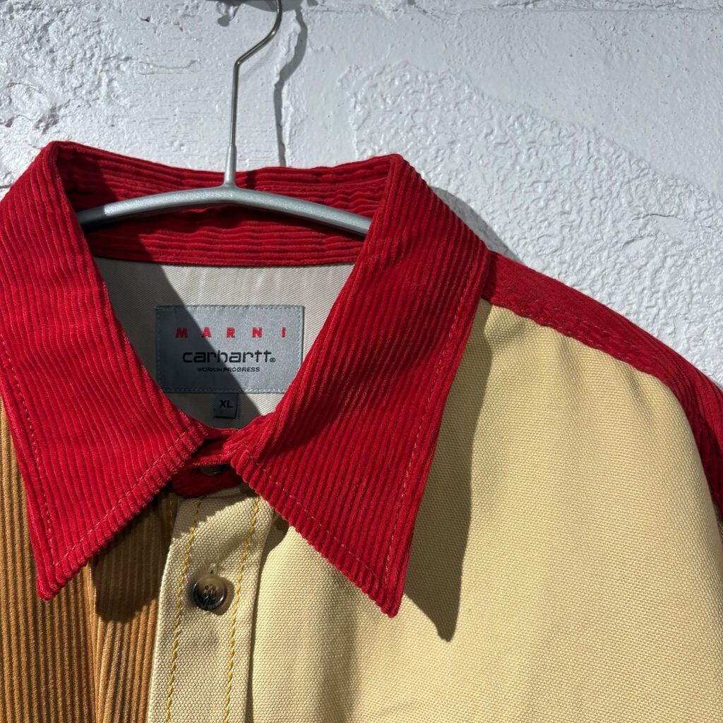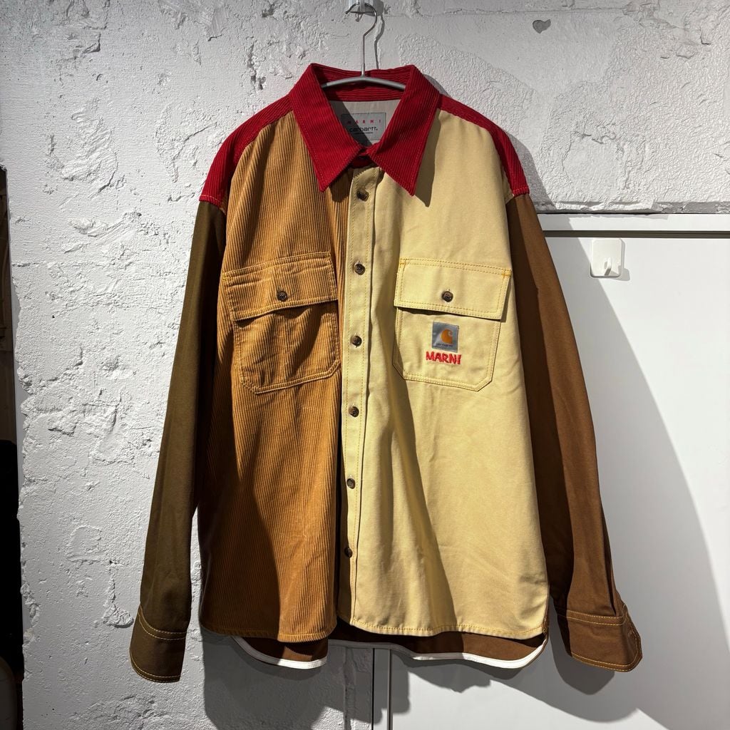 ウォッシュ加工を施したバイオコットンキャンバスとコットンコーデュロイを組み合わせて作られています。 胸ポケット2つとサイドポケット1つ。 Carhartt Work In Progress のロゴ パッチと「MARNI」ロゴが刺繍されています。