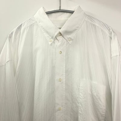 Maison Margiela(メゾン マルジェラ)の、ホワイトのオーバーサイズシャツ。刺繍のピンストライプ柄が飾られています。 フロントにはスリップポケットで後ろ身頃にロゴ刺繍。