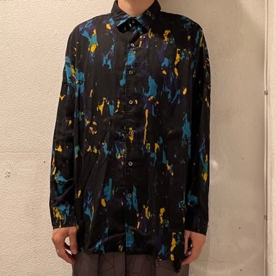 ペンキで描いたような抽象柄をプリントで表現したテキスタイル。 ソフトな肌触りと生地の落ち感が特徴です。 ワイドな身巾の長袖ビッグシャツ。