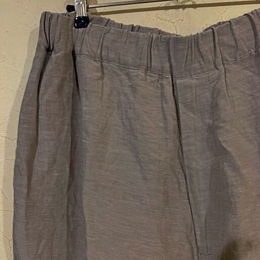 サイドに付いた紐でウエストを絞ることができるワイドパンツです。