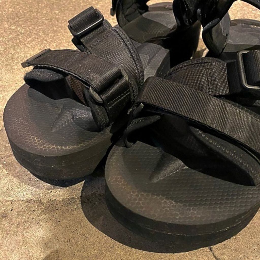 全体的に使用感、踵とつま先のソールの減り、インソール部分の汚れ、ストラップ部分の傷や接着の剥がれがあります。