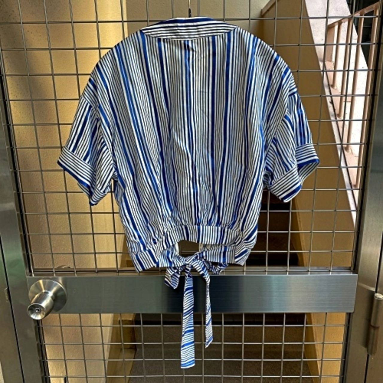 クロップドされたノーカラー半袖シャツです。
