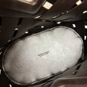 トライアングルの持ち手、テープを編み込み仕上げたイントレチャート、マグネットによる開閉など様々な魅了のある光沢感のあるカーフレザーを使用したアイテムです。