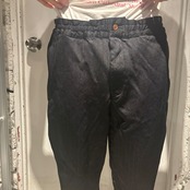 ストライプのシングルテーラードジャケットで袖以外がツギハギ加工になっており生地はポリ縮絨の為重めの生地感になっております。パンツはウエストに紐が入っておりベルトループがない為紐でウエストを締める仕様となっております。シルエットはストレートでテーパードがかかっております。