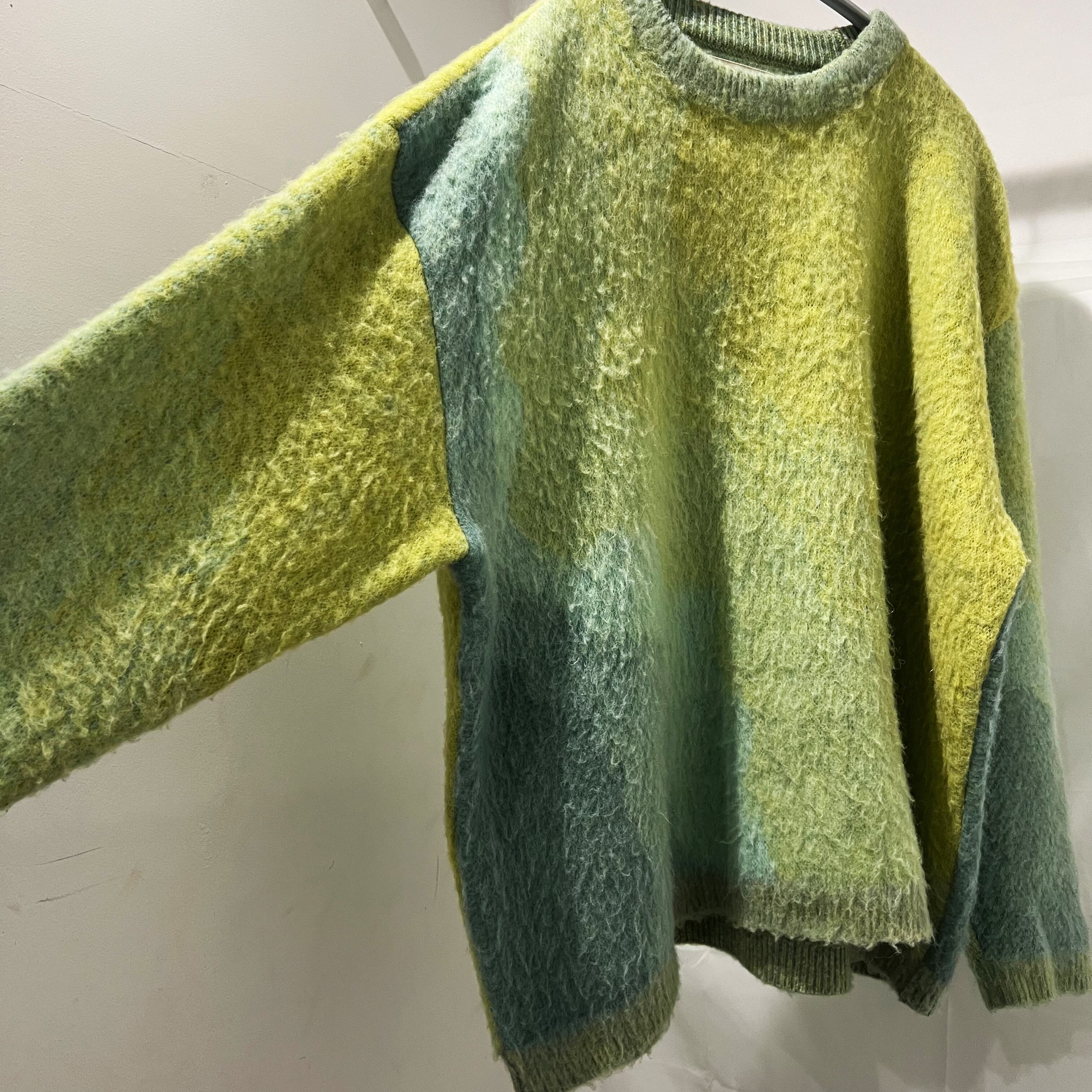 絵の具が滲んだ様子を多色のジャガードで<表現したクルーネックセーターです。